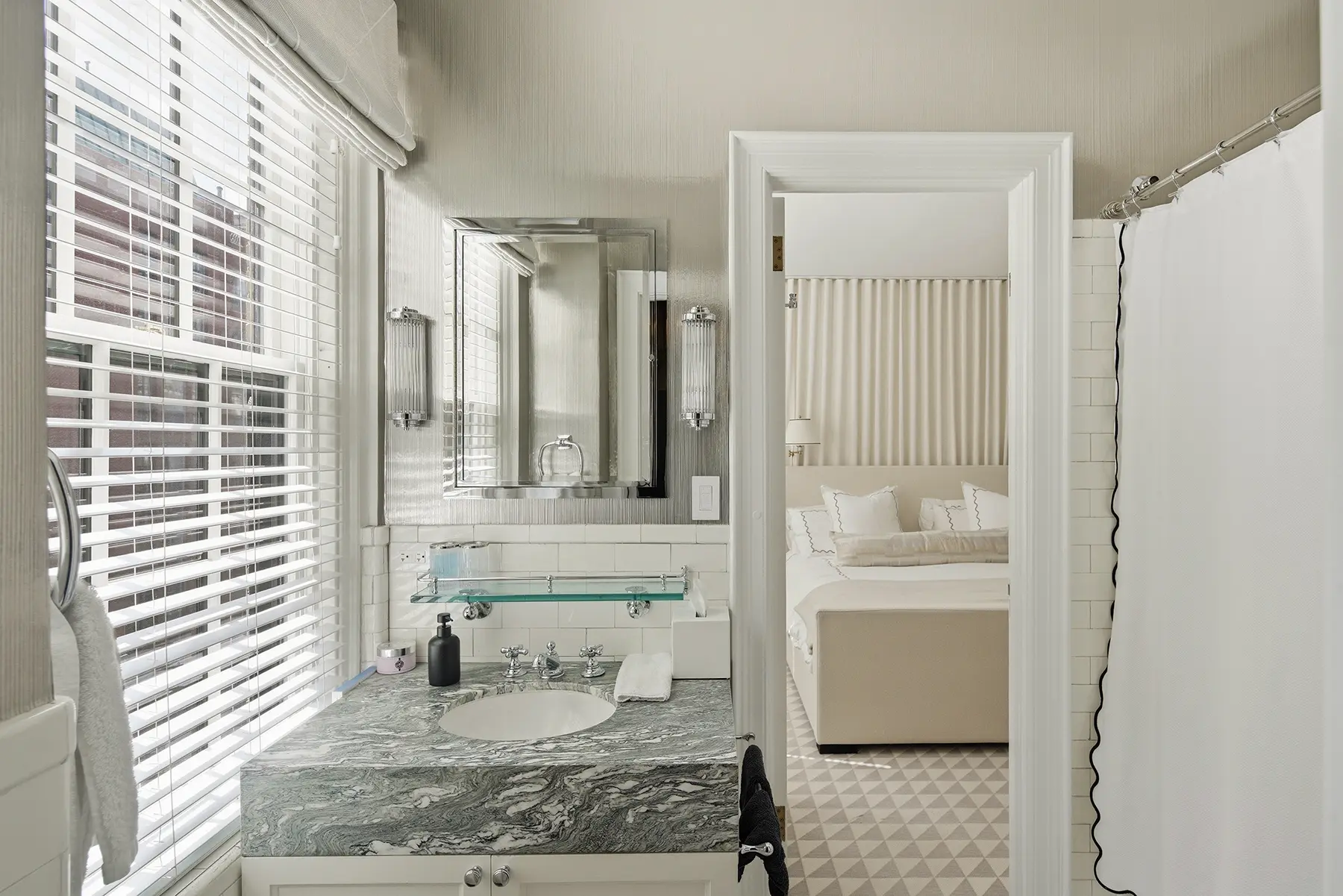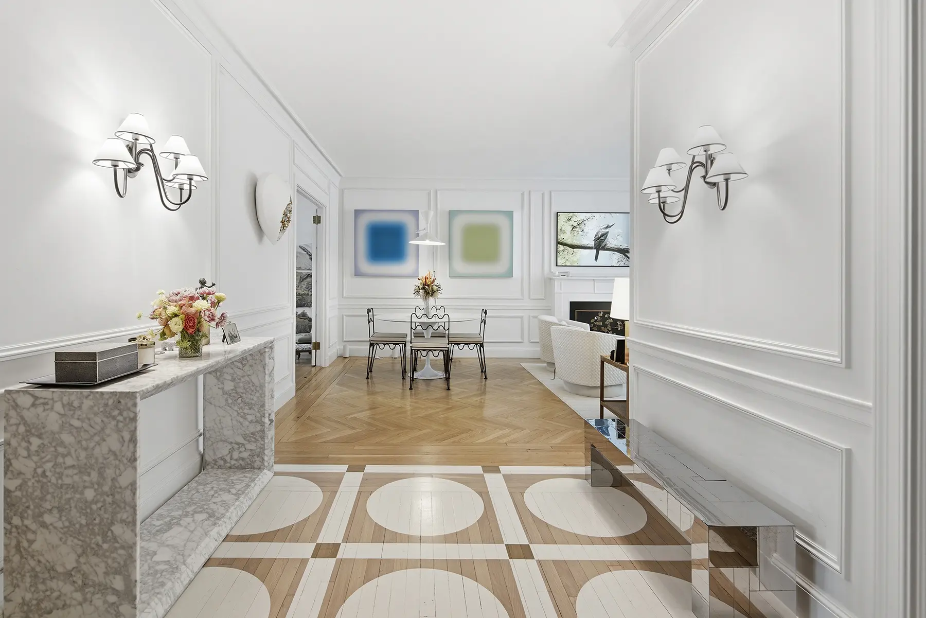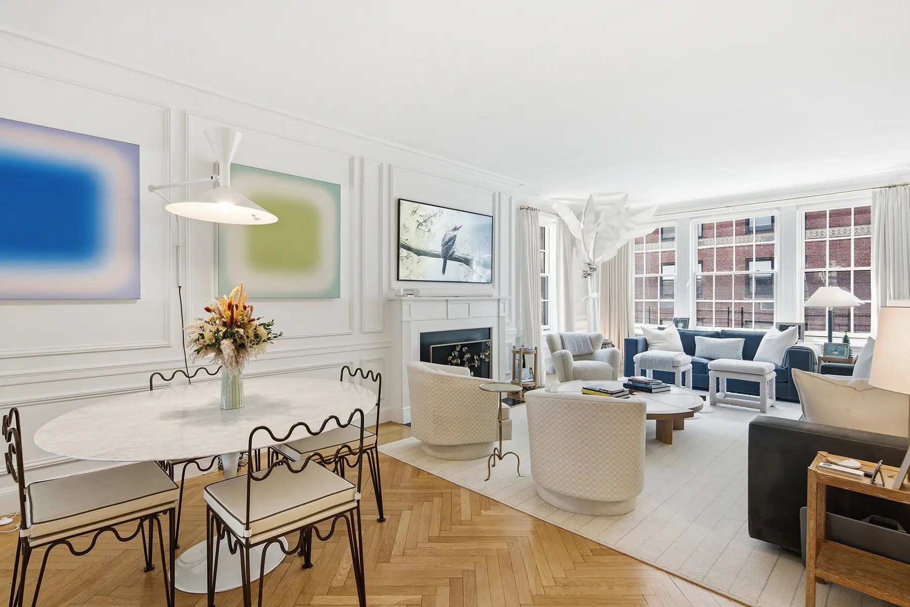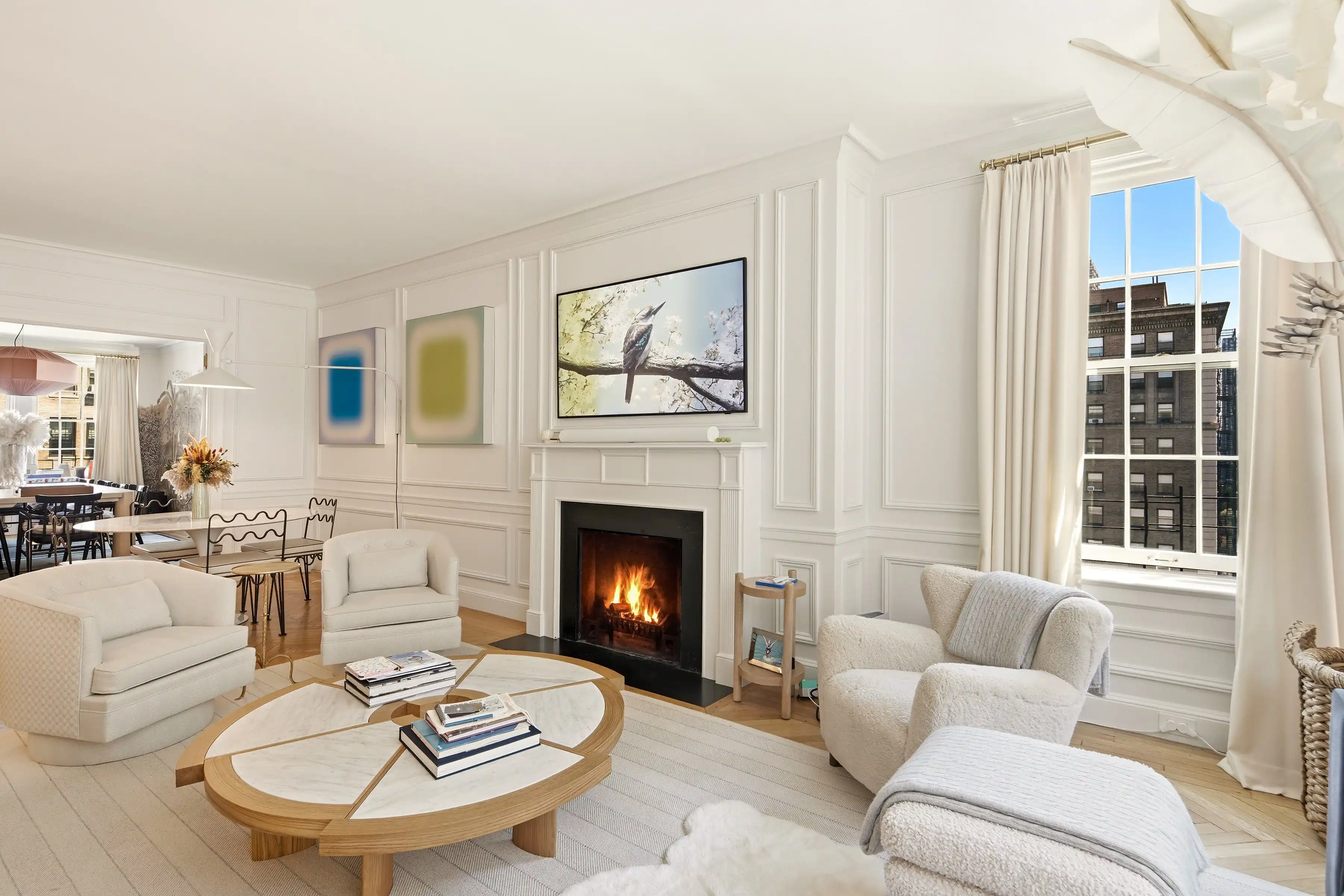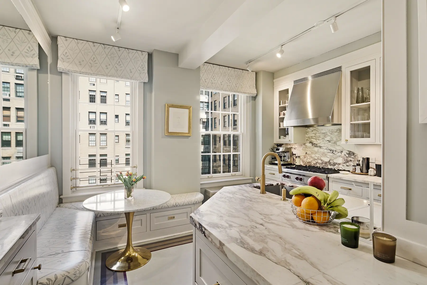 Recently renovated, the kitchen features richly veined Calacatta marble countertops and backsplash, bespoke cabinetry, a substantial center island, banquette seating, and premium appliances. Equal parts showpiece and workspace, it is as functional as it is beautiful. A butler's pantry and in-unit washer/dryer add further convenience.